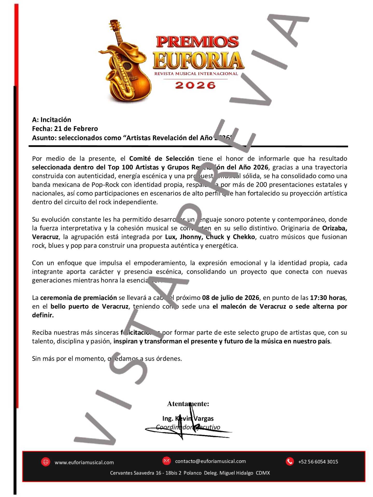 Es un honor dirigirnos a ustedes para comunicarles que han sido seleccionados para formar parte del Top 100 de Artistas y Grupos Revelación del Año 2026. Este reconocimiento distingue a las propuestas musicales más prometedoras y significativas del año, aquellas que están renovando el panorama sonoro y conquistando nuevos públicos con su voz propia.