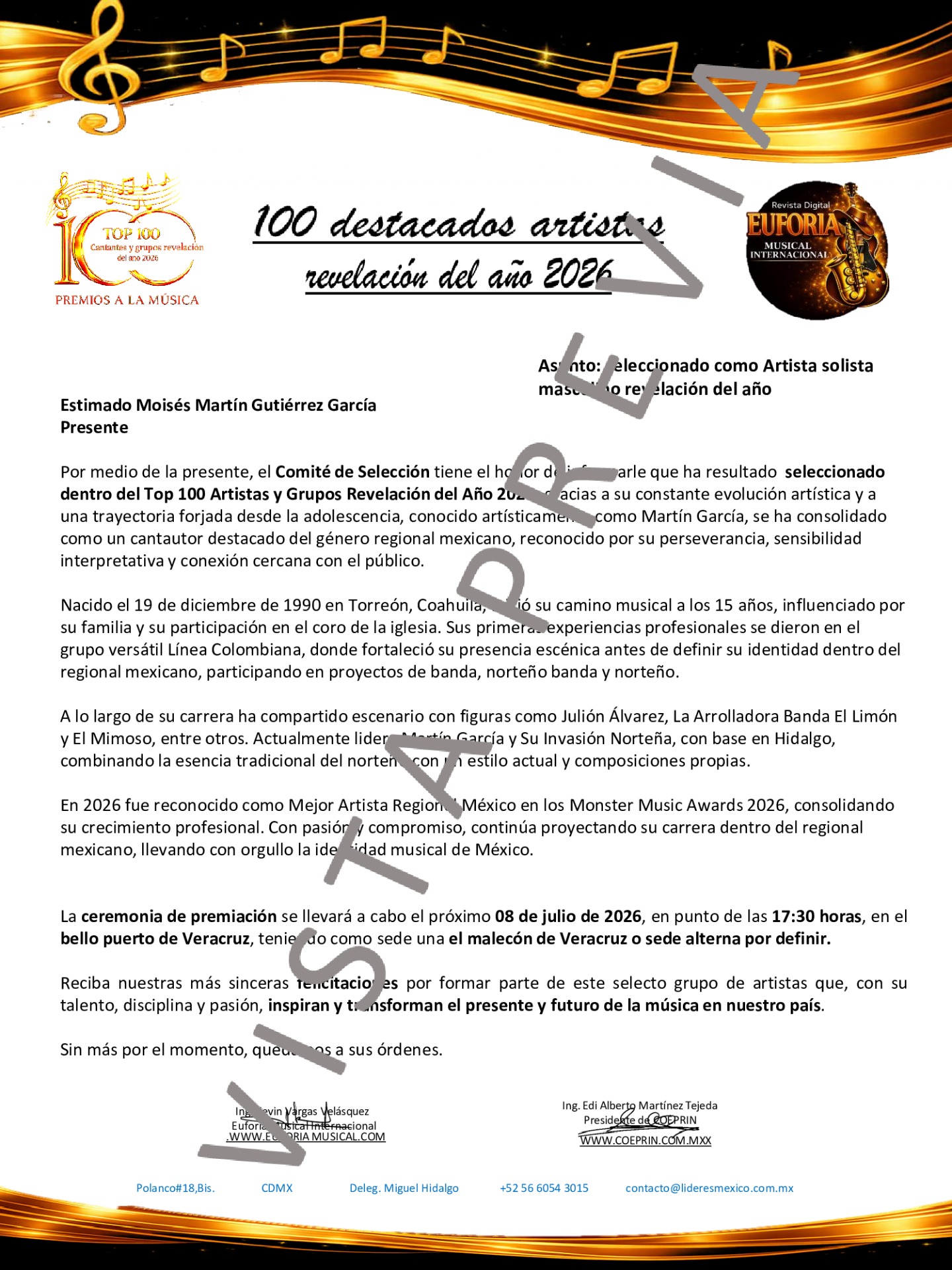Es un honor dirigirnos a usted para comunicarle que ha sido seleccionado para formar parte del Top 100 de Artistas y Grupos Revelación del Año 2026. Este reconocimiento distingue a las propuestas musicales más prometedoras y significativas del año, aquellas que están renovando el panorama sonoro y conquistando nuevos públicos con su voz propia.