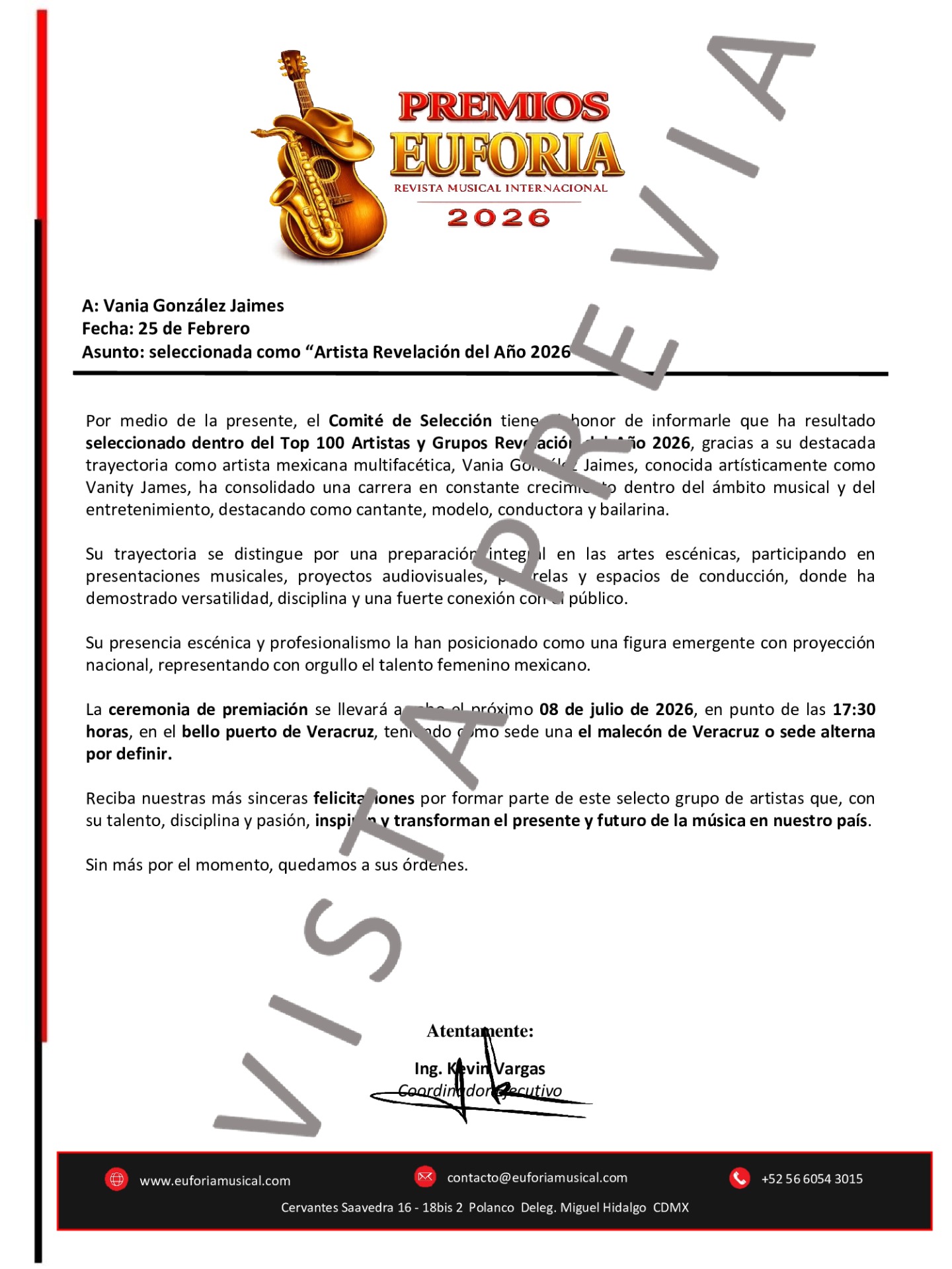Es un honor dirigirnos a usted para comunicarle que ha sido seleccionada para formar parte del Top 100 de Artistas y Grupos Revelación del Año 2026. Este reconocimiento distingue a las propuestas musicales más prometedoras y significativas del año, aquellas que están renovando el panorama sonoro y conquistando nuevos públicos con su voz propia.