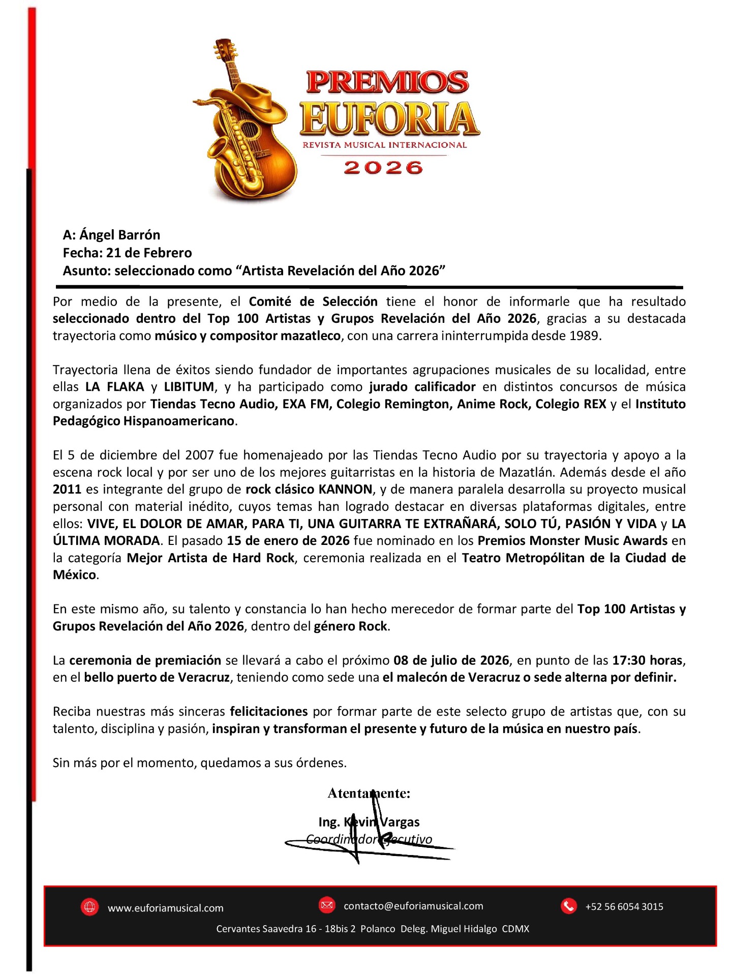Es un honor dirigirnos a usted para comunicarle que ha sido seleccionado para formar parte del Top 100 de Artistas y Grupos Revelación del Año 2026. Este reconocimiento distingue a las propuestas musicales más prometedoras y significativas del año, aquellas que están renovando el panorama sonoro y conquistando nuevos públicos con su voz propia.