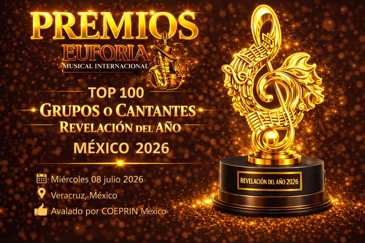 México se alista para vivir una de las celebraciones musicales más importantes del año. El próximo 8 de julio de 2026, el ritmo, la emoción y el talento emergente se concentrarán en Veracruz, sede de los Premios Top 100 Artistas y Grupos Revelación del Año 2026, dentro de los Premios Euforia Musical Internacional.