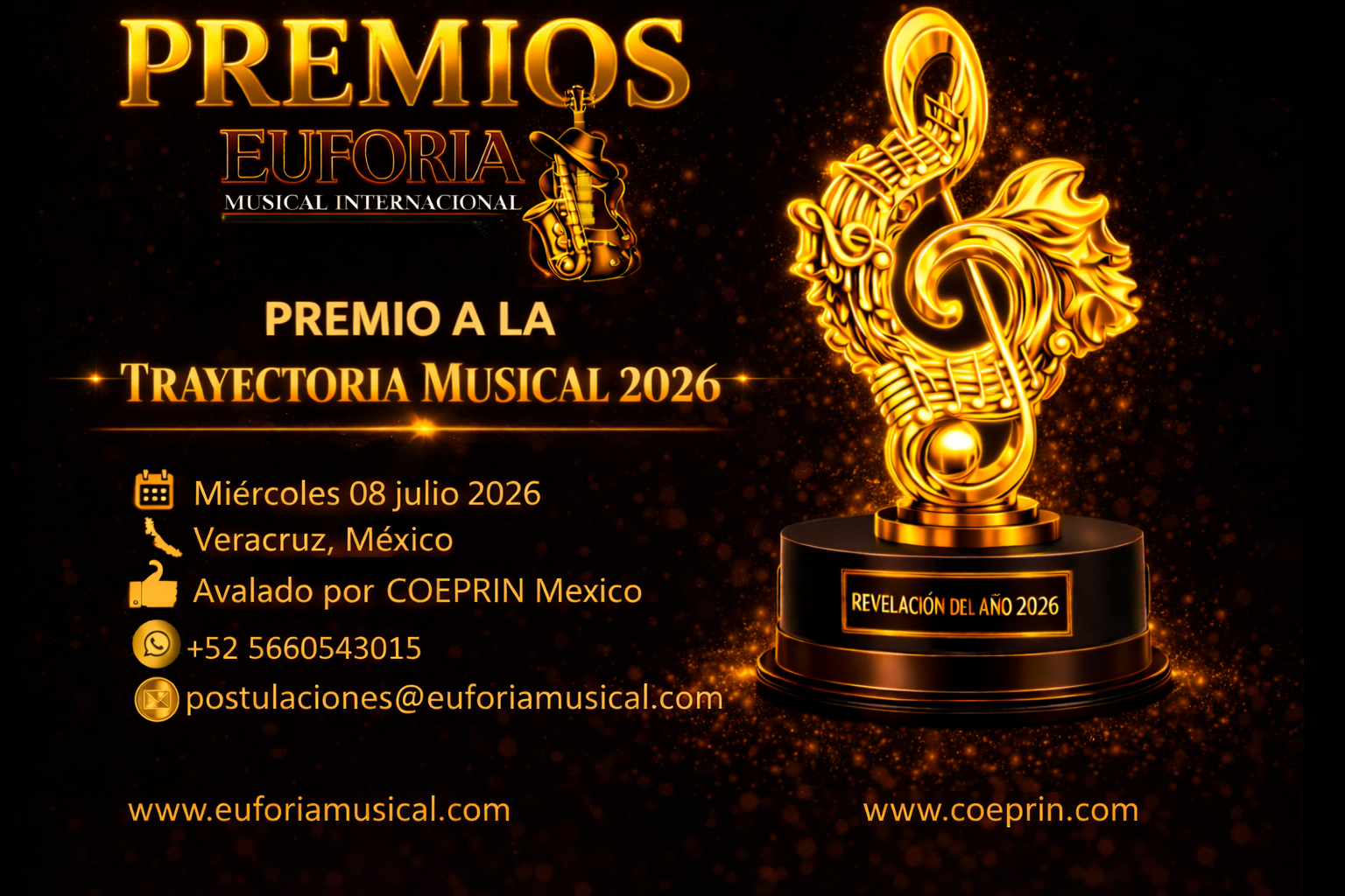 La organización de los Premios Euforia Musical Internacional tiene el honor de extenderle una distinguida invitación para formar parte del exclusivo